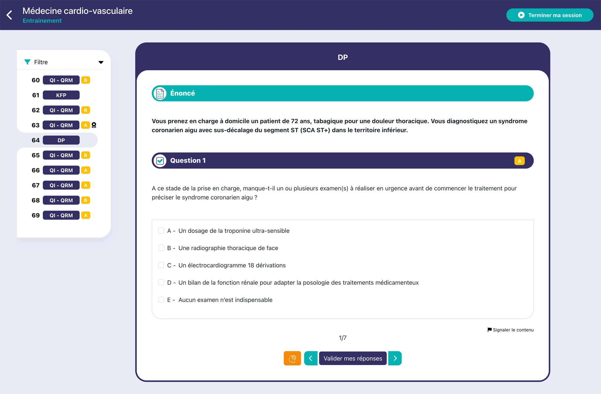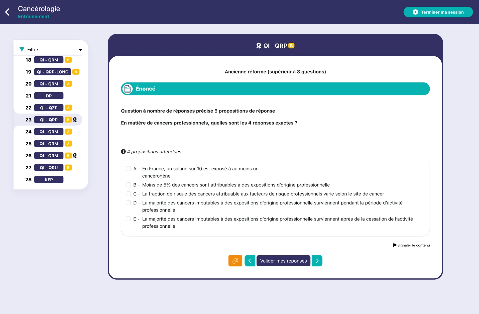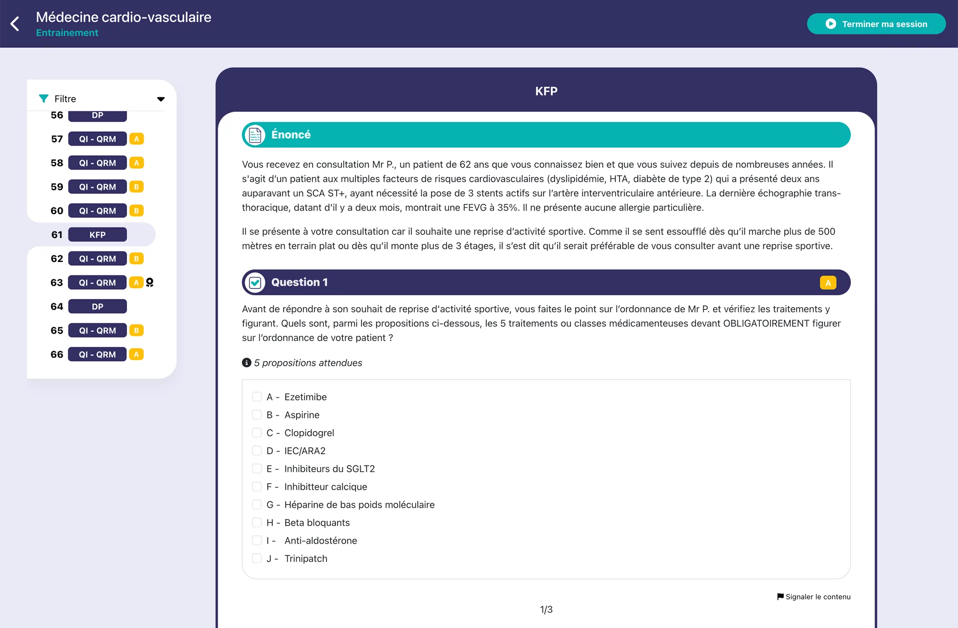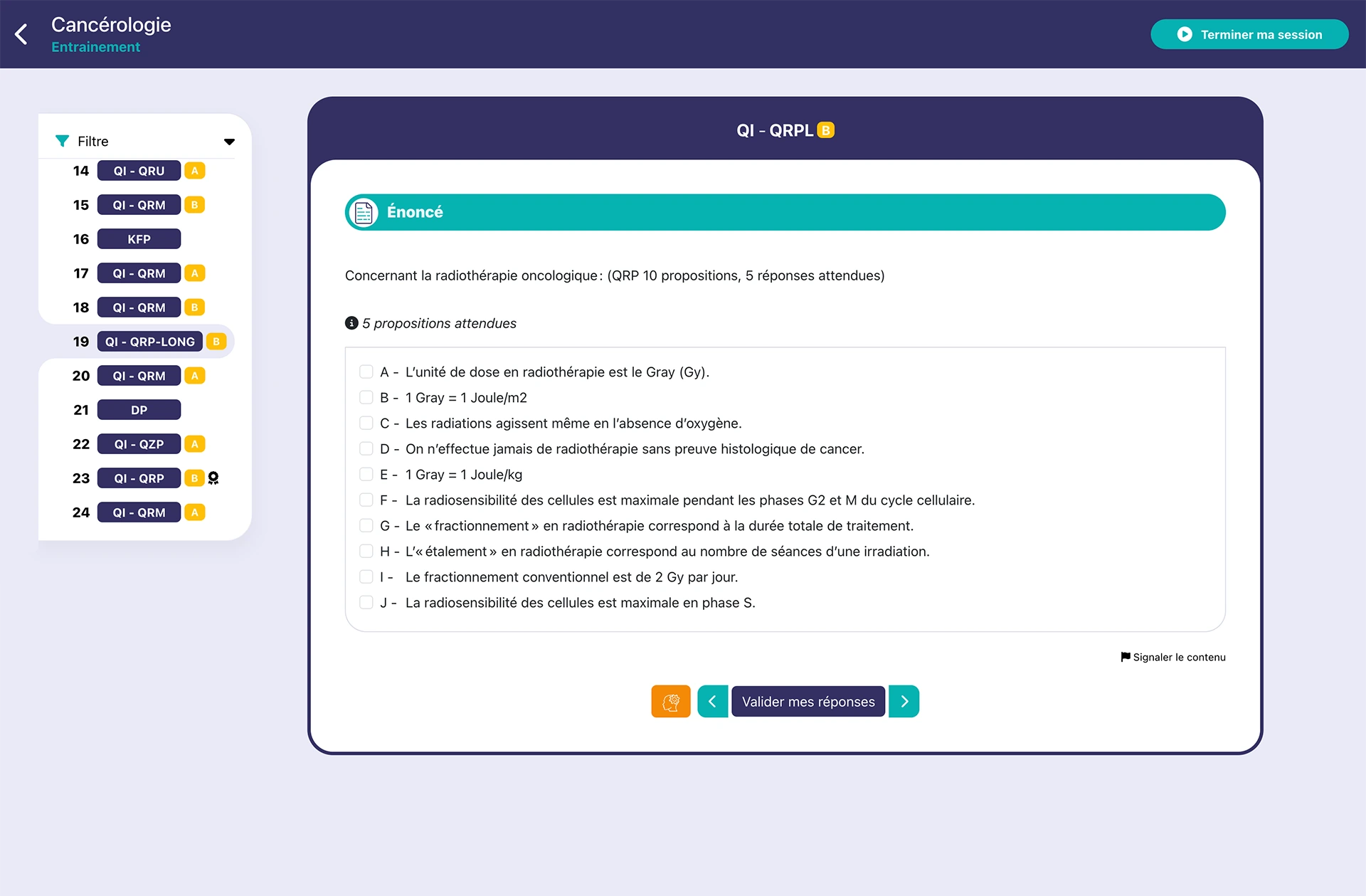 Un minuteur pour être dans les conditions réelles d’examen. Un examen blanc avec toutes types de questions possibles : DP, QI-QRM, QI-QZONE, TCS, KFP